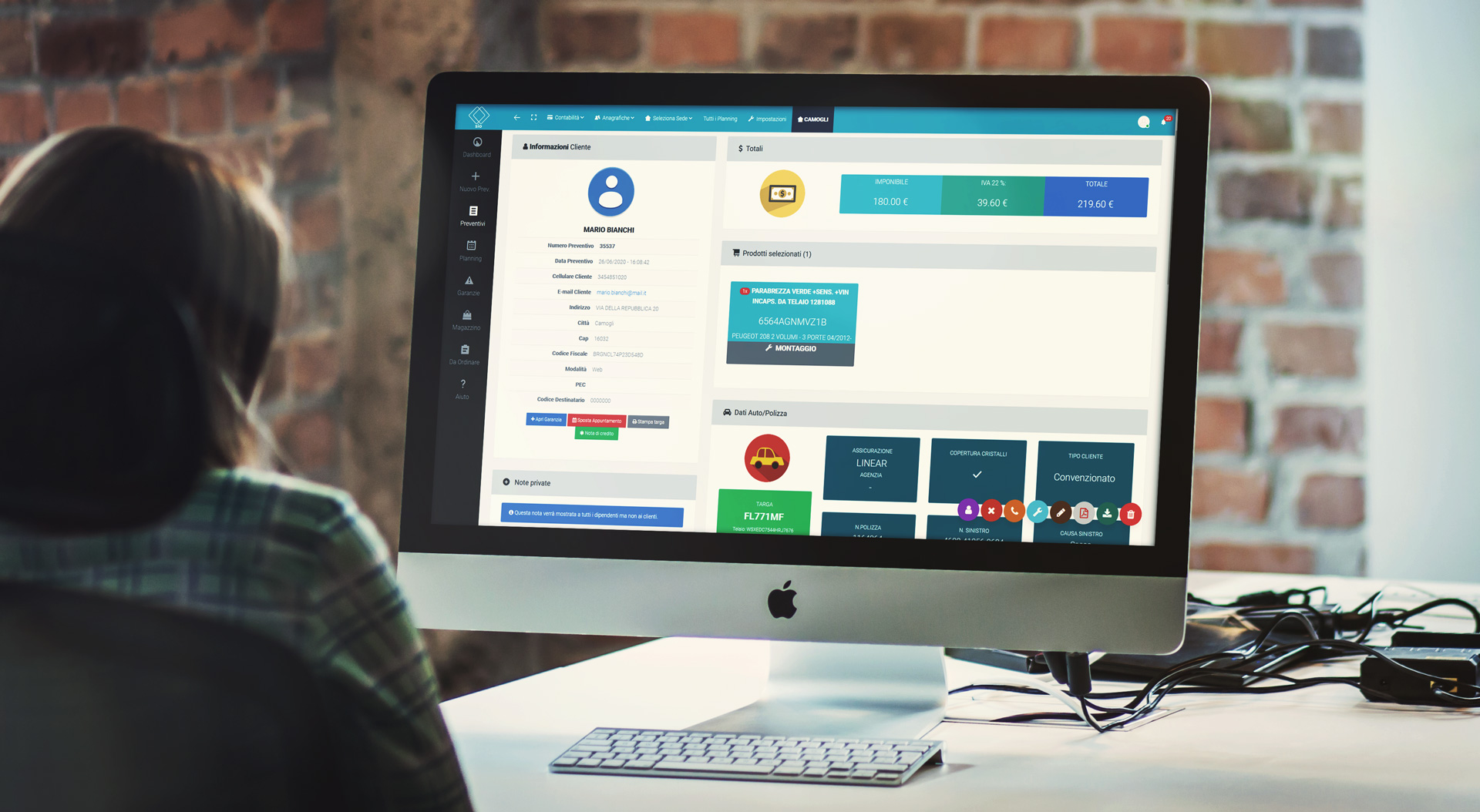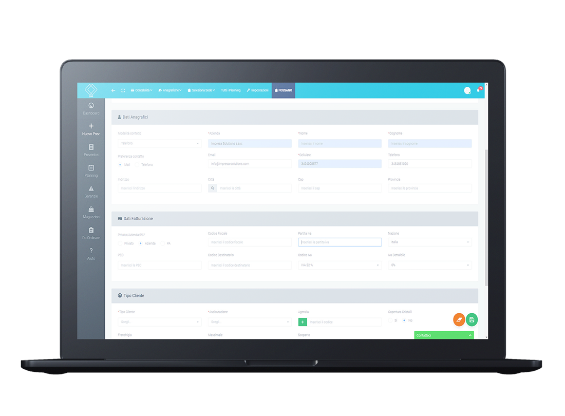 Il tutto gestibile da pc, tablet o smartphone ovunque tu sia.Sio ha una creazione guidata del preventivo in modo da aiutare chi lo utilizza a non dimenticare nessun dato importante! Grazie al database dei comuni italiani il cap e la provincia vengono compilati in automatico. Vengono memorizzati tutti i dati del cliente e dell'auto. È anche possibile creare listini personalizzati per tipi di cliente.